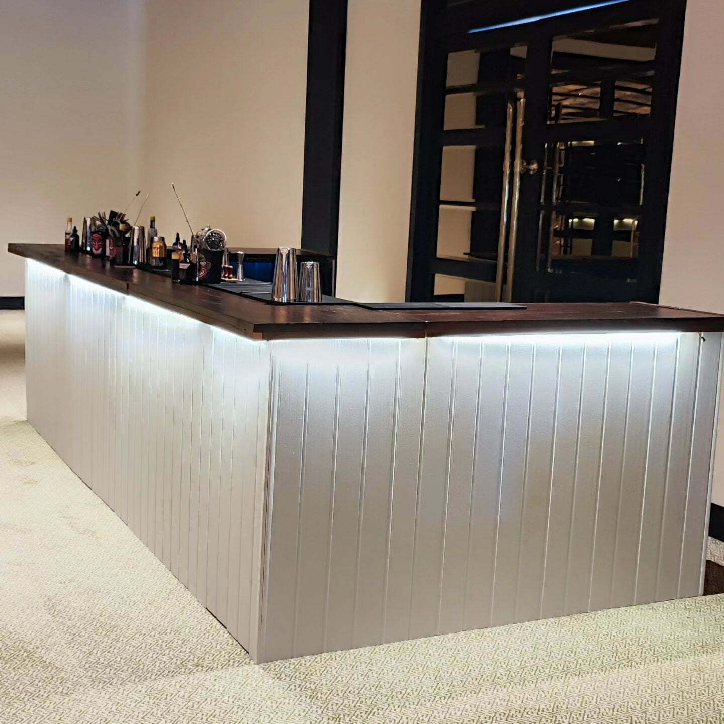 For the professionals behind the counter, the ample shelving space is a dream, ensuring everything is within arm’s reach. The intricate lighting subtly highlights the panels, crafting a mesmerizing ambiance, perfect for weddings, corporate events, or personal life celebrations. And for those keen on adding a personal touch, the option to affix a custom monogram on the front awaits.